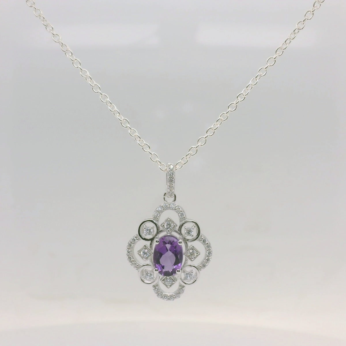 Elegant and eye-catching, this sterling silver pendant features a rich purple amethyst at its heart, surrounded by a dazzling cluster of cubic zirconia. The deep hues of the amethyst are beautifully offset by the brilliance of the CZ stones, creating a luxurious sparkle that’s perfect for any occasion.