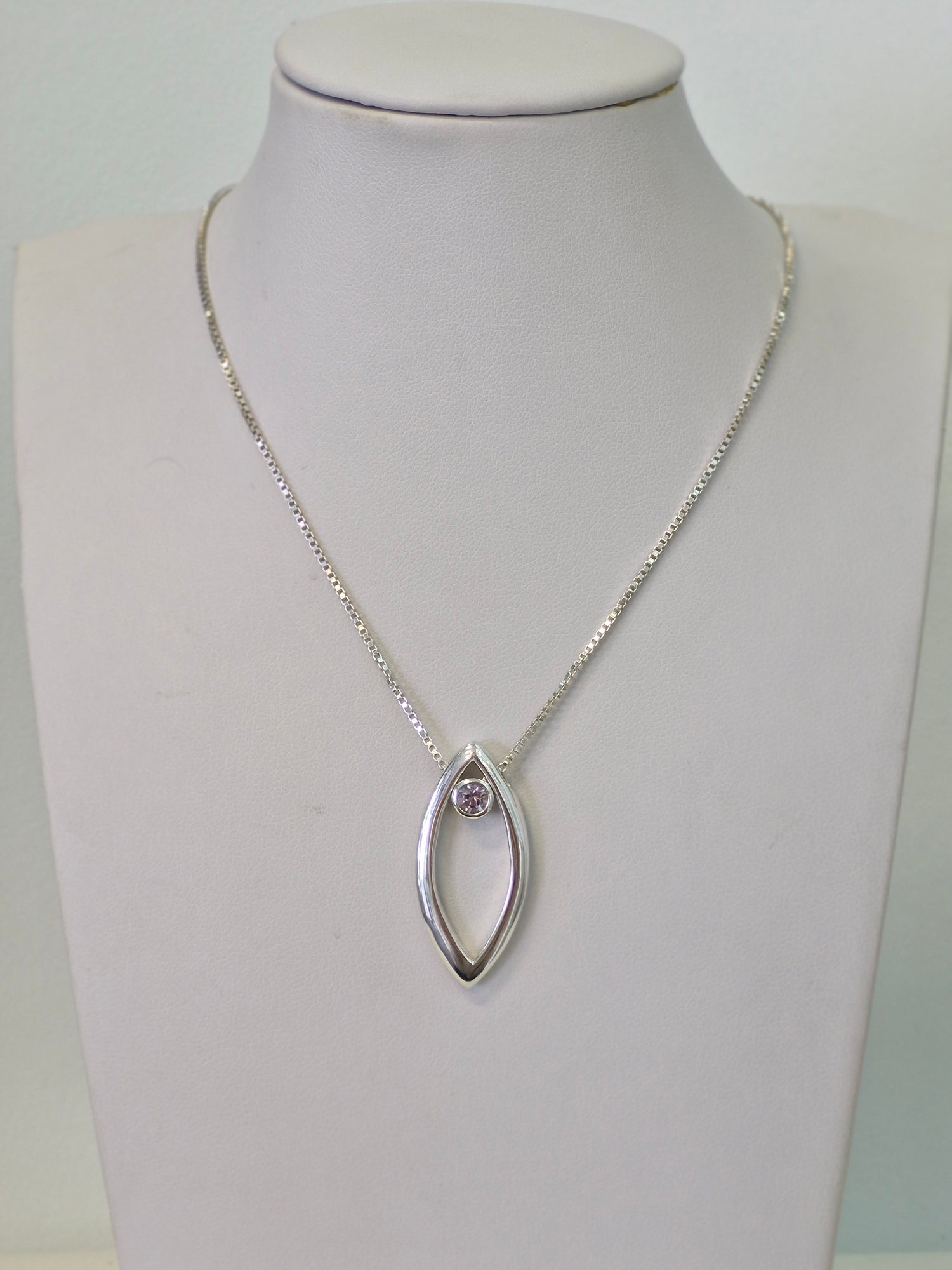 Sterling Silver cut-out marquise shaped pendant, set with a amethyst. On a sterling silver box chain