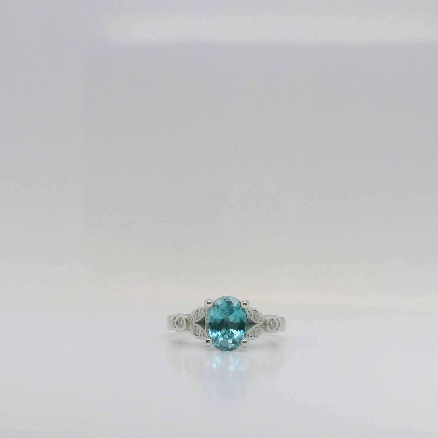 Beautifully crafted in enduring platinum, this elegant ring features a vivid oval-cut blue zircon at its center, celebrated for its brilliant sparkle and rich teal-blue hue. Flanking the zircon are four white diamonds set on either side, adding balanced brilliance and classic refinement to the design. With a 2.5mm band and a size O fit, this ring combines timeless elegance with a pop of vibrant color—perfect as a unique statement or a treasured gift.