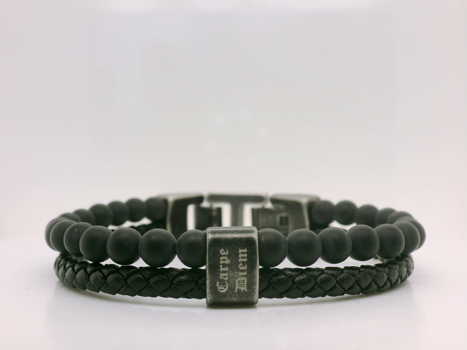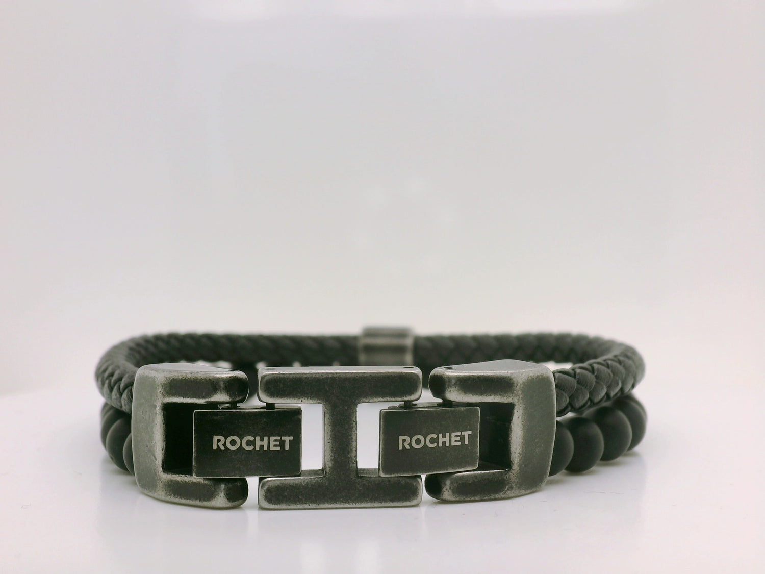 Rochet Black Leather Braided & Beaded Bracelet with Oxidised Stainless Steel Clasp