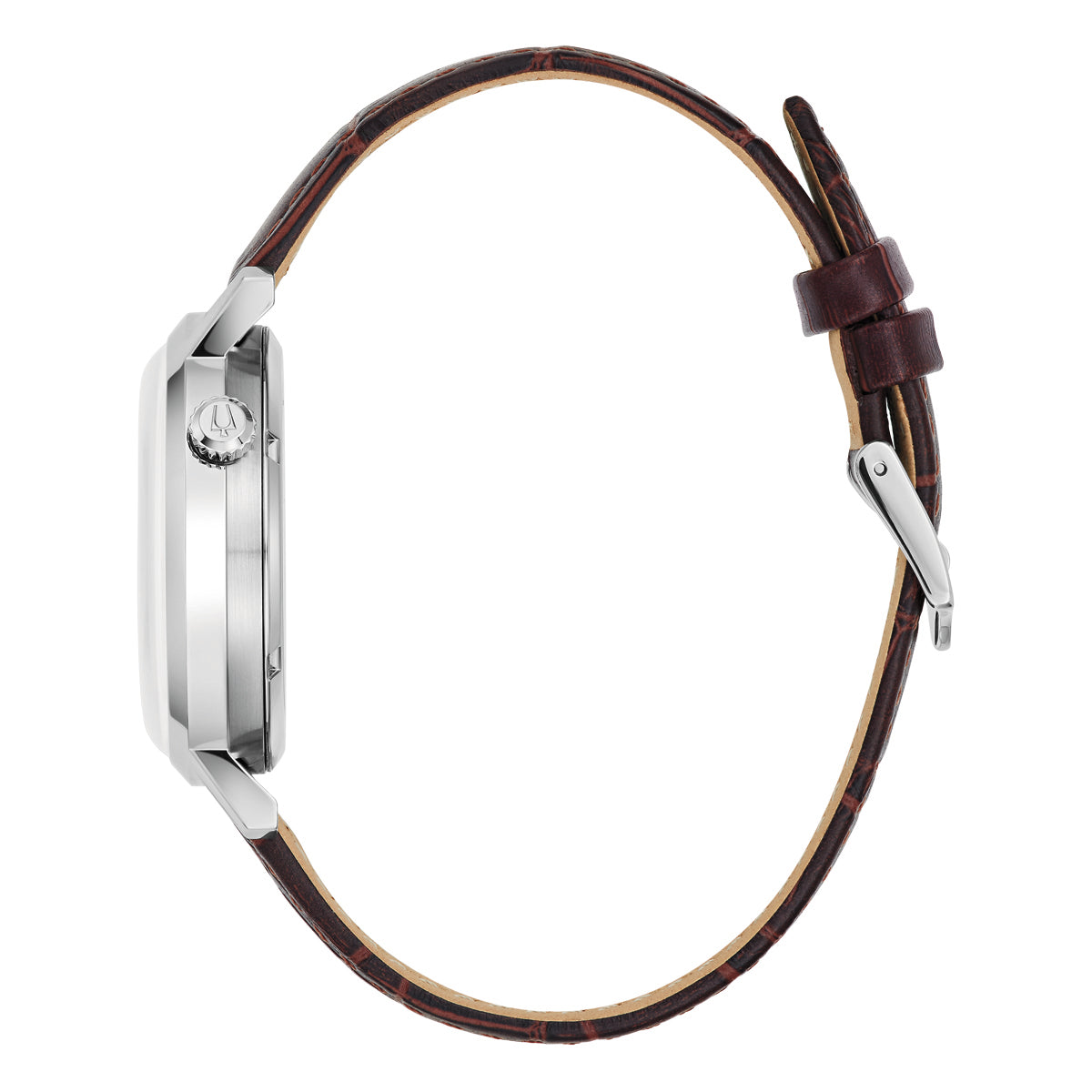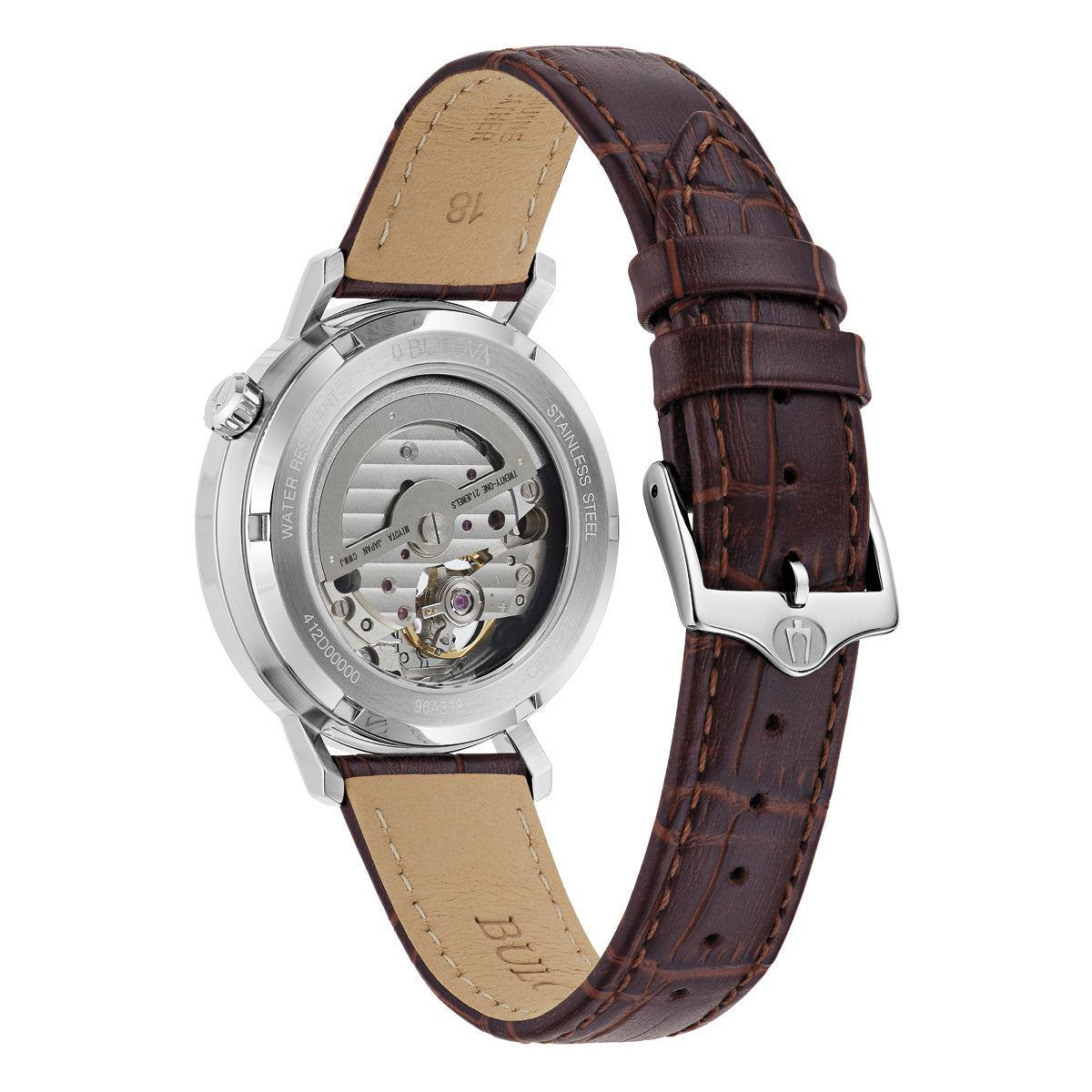 Stainless steel case with silver-tone crown at two o'clock position, open aperture grey dial with silver hands and markers, exhibition case back, automatic heart-beat self-winding movement with 40-hour power reserve, boxed mineral glass, croc-embossed brown leather strap with three-piece buckle closure, and water resistance to 30 meters