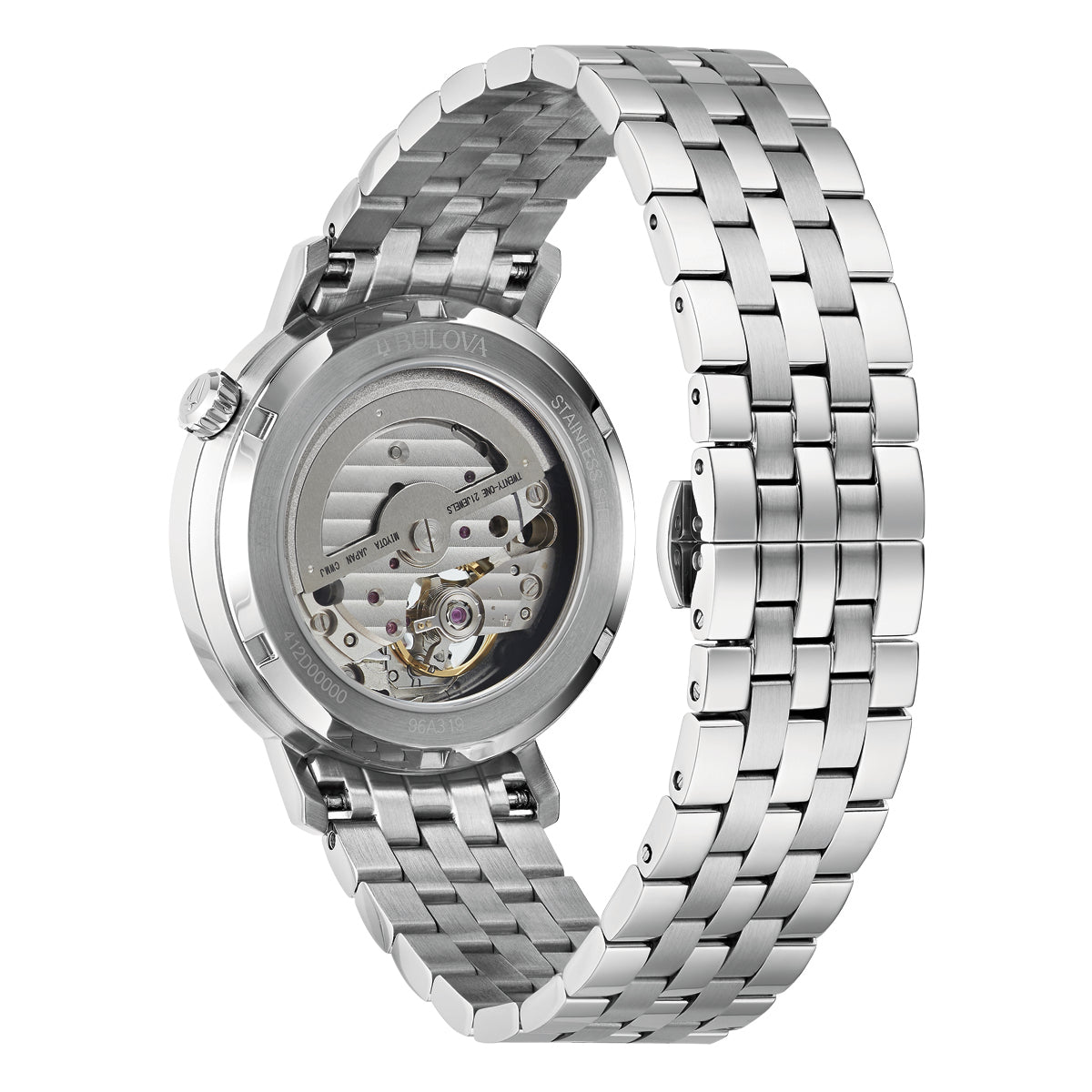 Stainless steel case with silver-tone crown at two o'clock position, open aperture grey dial with silver hands and markers, exhibition case back, automatic heart-beat self winding movement with 40-hour power reserve, boxed mineral crystal glass, stainless steel bracelet with three-piece buckle closure, and water resistance to 30 meters.