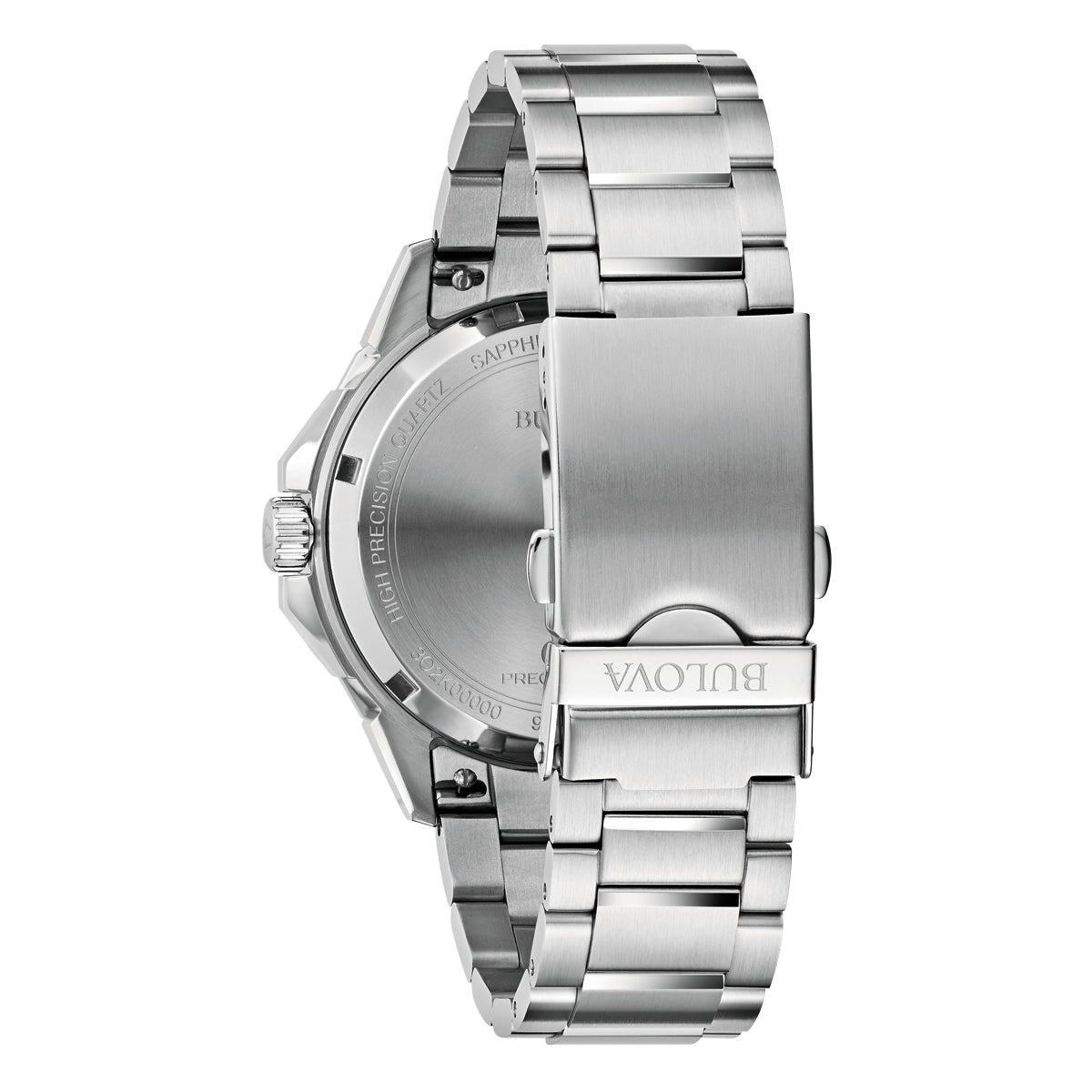 An incredibly bold design, this Gent's Bulova Marine Star Precisionist sport watch pushes the limits with Bulova's cutting edge technology and a strikingly modern case. Defined by a rugged, angular profile, the 43mm stainless steel case features brushed facets and polished accents, with a unidirectional timing bezel with a ceramic insert, a sapphire crystal, and a screw-down crown ensuring 200m water resistance. The vibrant blue dial takes its inspiration from the undulating crests of the ocean, with a wave pattern accented by applied hour markers and a bold handset, all featuring luminescent material for unrivaled legibility in all conditions. A date window is positioned at 3 o'clock, while the red-tipped seconds hand sweeps smoothly around the dial thanks to Bulova's proprietary precisionist movement, a revolutionary 8-jewel quartz mechanism vibrating at a remarkable 262kHz and accurate to 10 seconds per year with increased resistance to temperature changes. Paired with a durable stainless steel bracelet with a pin buckle closure, this Gent's Bulova timepiece is equipped to handle everything from the office to the ocean.