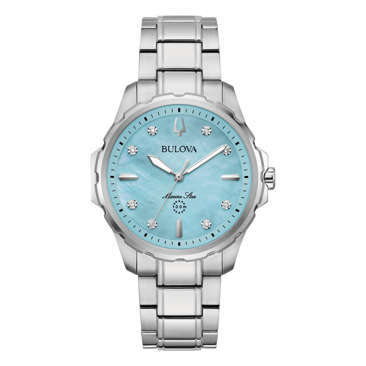 From the legendary Bulova Marine Star Collection, this elegant ladies' timepiece offers unrivaled style. The silver-tone stainless steel case features a modern design with a bold crenellated fixed bezel and symmetrical case flanks. A flat sapphire crystal and protected crown provide modern reliability which is furthered by 100 meter of water resistance. The lustrous blue mother-of-pearl dial adds a splash of colour to the timepiece, with eight diamond hour markers and a refined handset with luminescent fill for superb legibility in all conditions. The watch is paired with a dual-finished silver-tone quick-release stainless steel bracelet with a push-button deployant closure that provides both comfort and security. For timeless elegance no matter the occasion, this Bulova ladies' timepiece makes the perfect companion.