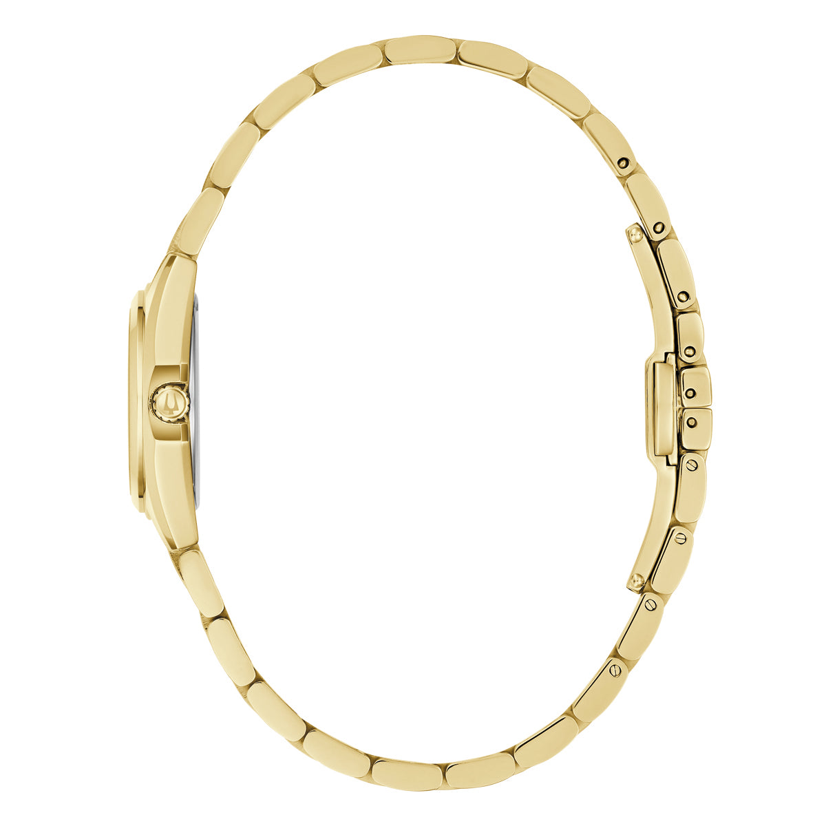 Defined by exceptional quality and sophisticated aesthetics, the Bulova ladies' Surveyor is the quintessenial modern timepiece updated with a mini 23mm case. Sculpted edges and faceting distinguish the gold-tone stainless steel case, with polished and brushed finishing, a flat sapphire crystal, and a matching 3-link gold-tone stainless steel bracelet with a push-button deployant clasp and easy-release latched spring bars. The radiant pink dial has a sunburst finish and gold-tone accents and hands with luminescent fill. For those with a discerning eye for refined luxury, this Bulova Ladie's timepiece is the perfect everyday companion.