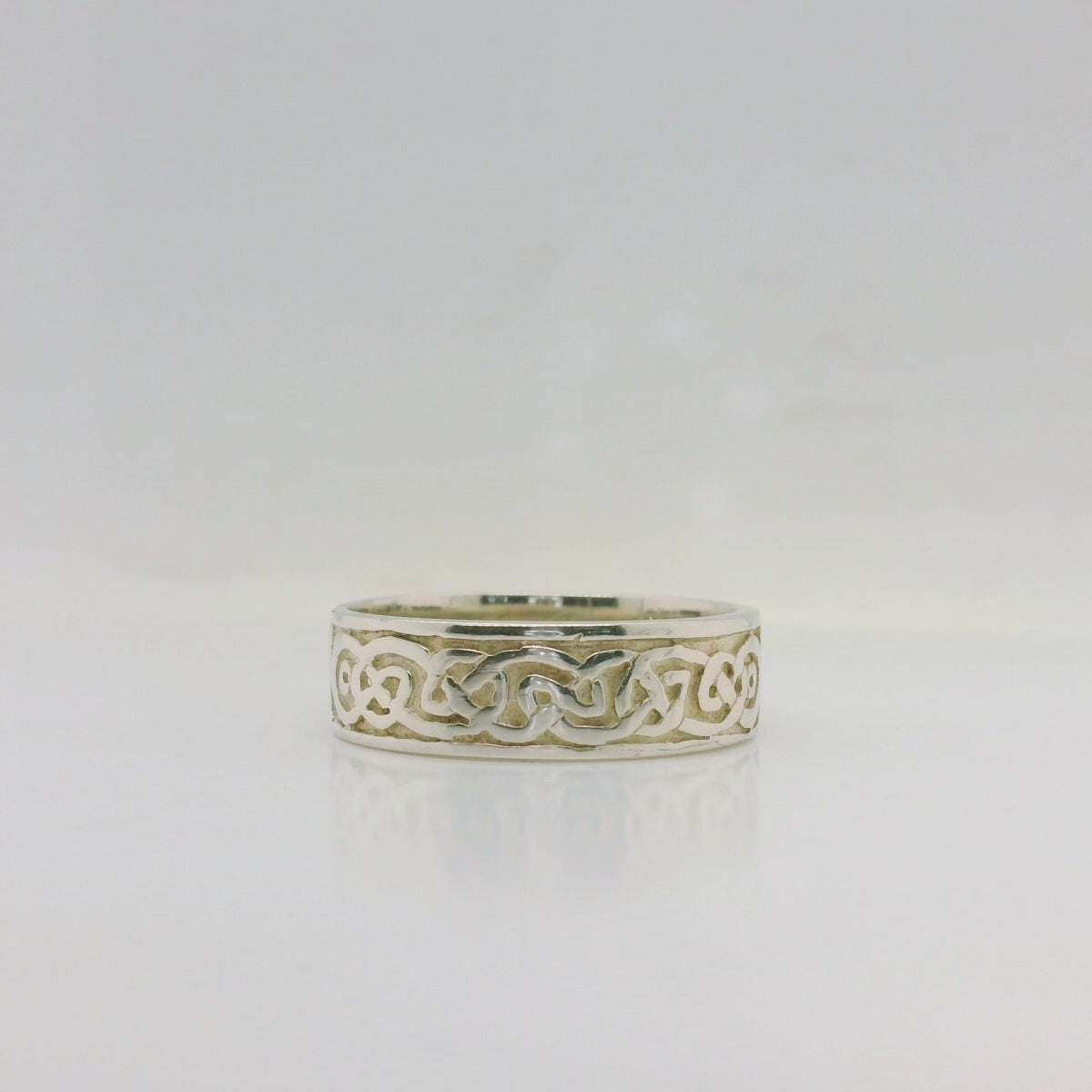 This classic sterling silver band features an intricate Celtic design, symbolizing heritage and eternity. With a comfortable 7mm band width and sized X, it’s a versatile piece perfect for everyday wear or as a meaningful gift.