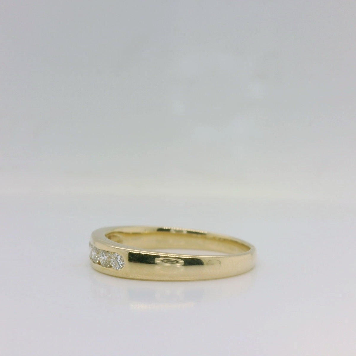 Sleek and sophisticated, this 9ct yellow gold ring features a classic channel setting that securely holds seven sparkling diamonds across the top of the band. With a slim 1.8mm profile, the design is refined yet radiant, perfect for everyday elegance or special occasions.