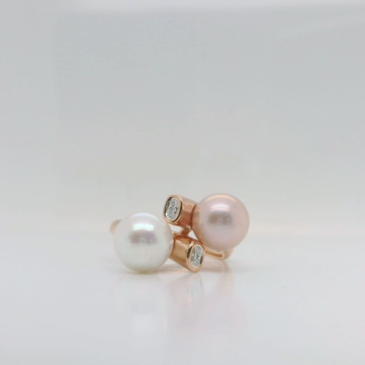 A striking design that blends romance and elegance, this 9ct rose gold ring features two luminous 9mm round Edison pearls—one soft white, the other delicate pink. Accented with sparkling 1.2mm diamonds, the pearls are showcased in a graceful setting that highlights their natural beauty. With its warm rose gold tones and captivating contrast, this ring makes a statement of timeless sophistication.