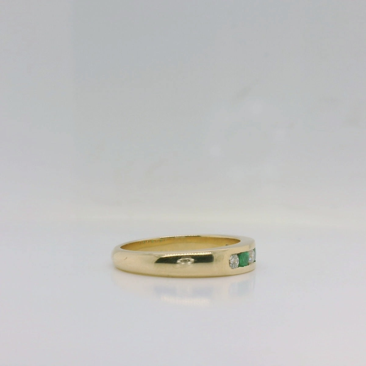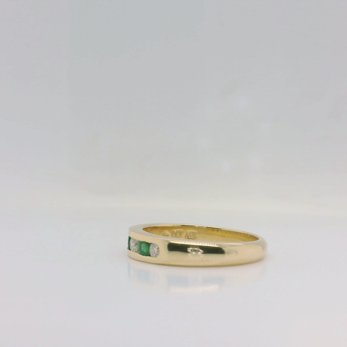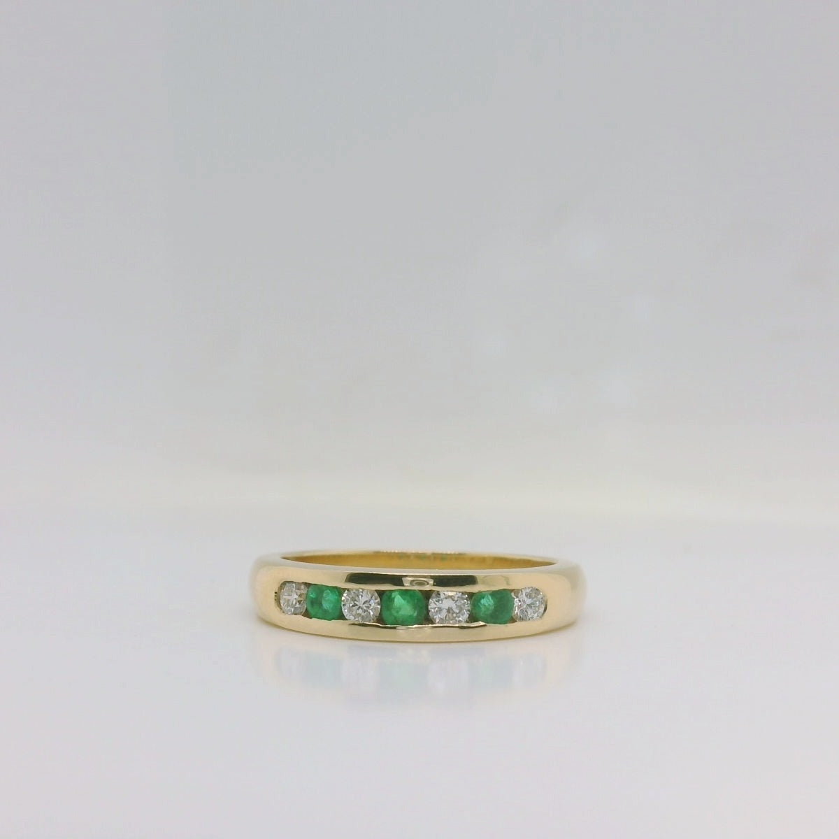This timeless 9ct yellow gold ring features a sleek channel setting adorned with alternating vibrant emeralds and sparkling white diamonds. The rich green of the emeralds pairs beautifully with the warm tone of the gold, while the diamonds add a touch of refined brilliance. With a 2.9mm band and a comfortable size Q fit, this ring offers a perfect balance of colour, elegance, and everyday wearability—ideal as a meaningful gift or a treasured addition to any jewellery collection.