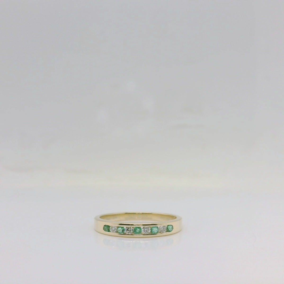 A timeless blend of elegance and colour, this 9ct yellow gold ring features a sophisticated channel setting adorned with alternating emeralds and diamonds. The rich green hues of the emeralds are beautifully complemented by the brilliance of the diamonds, creating a classic and eye-catching design. Crafted in warm yellow gold, this ring is perfect for marking a special occasion or adding a refined touch to your everyday style.