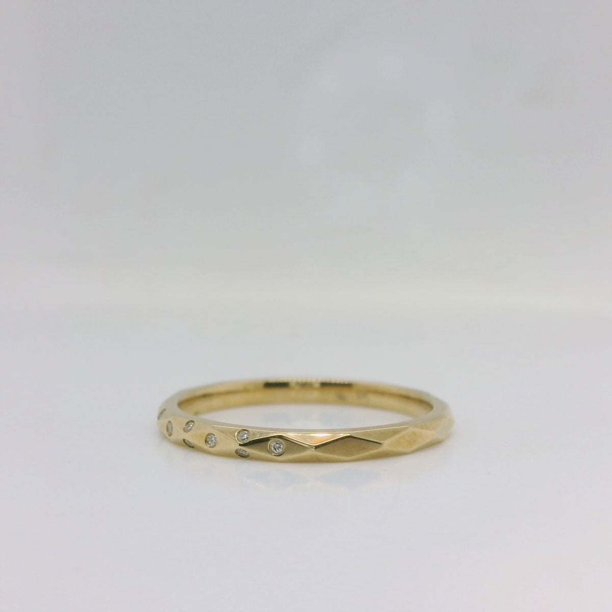 Delicate yet distinctive, this 9ct yellow gold ring features a finely faceted band that shimmers with subtle texture and light. Scattered diamonds are artfully set across the 1.5mm band, adding a touch of sparkle without overpowering the minimalist design.