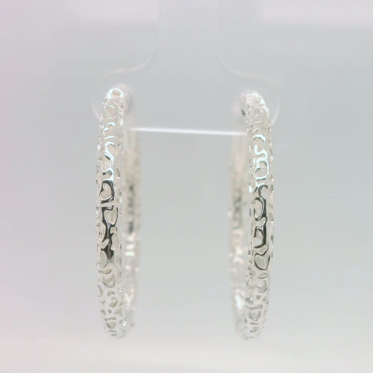 Intricately designed, these Sterling Silver Cut-Out Filigree Large Hoop Earrings showcase delicate craftsmanship with beautiful openwork patterns. Featuring a secure safety latch closure, they combine elegance and practicality in a standout statement piece perfect for any occasion.