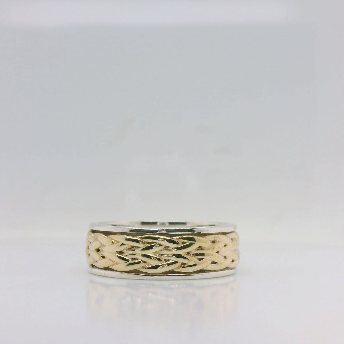 A striking fusion of metals and craftsmanship, this Gents Sterling Silver & 9ct Yellow Gold Woven Four-Row Inlay Ring combines cool sterling silver with warm yellow gold accents in a sophisticated woven design. Measuring 7.6mm wide, the four-row inlay creates a textured, layered effect that is both modern and timeless.