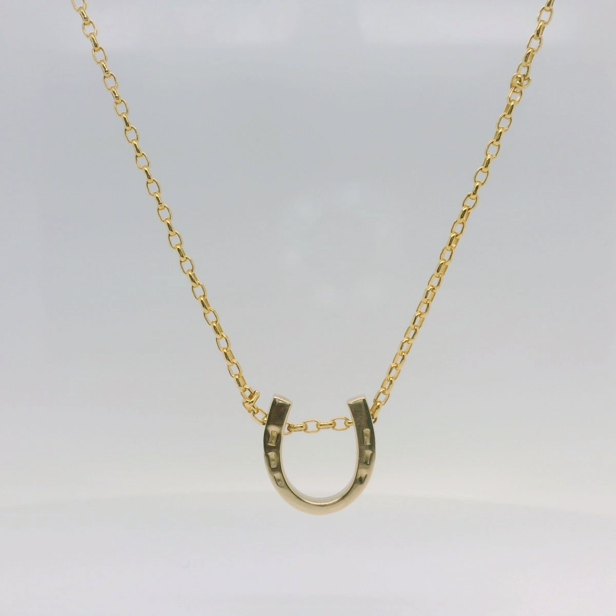 Bring a touch of luck and elegance with this handcrafted 9ct yellow gold horseshoe pendant, designed as a delicate slider. Measuring 12mm, it hangs gracefully on a 45cm 9ct yellow gold fine oval belcher chain. A timeless piece, perfect for layering or wearing on its own for everyday charm.