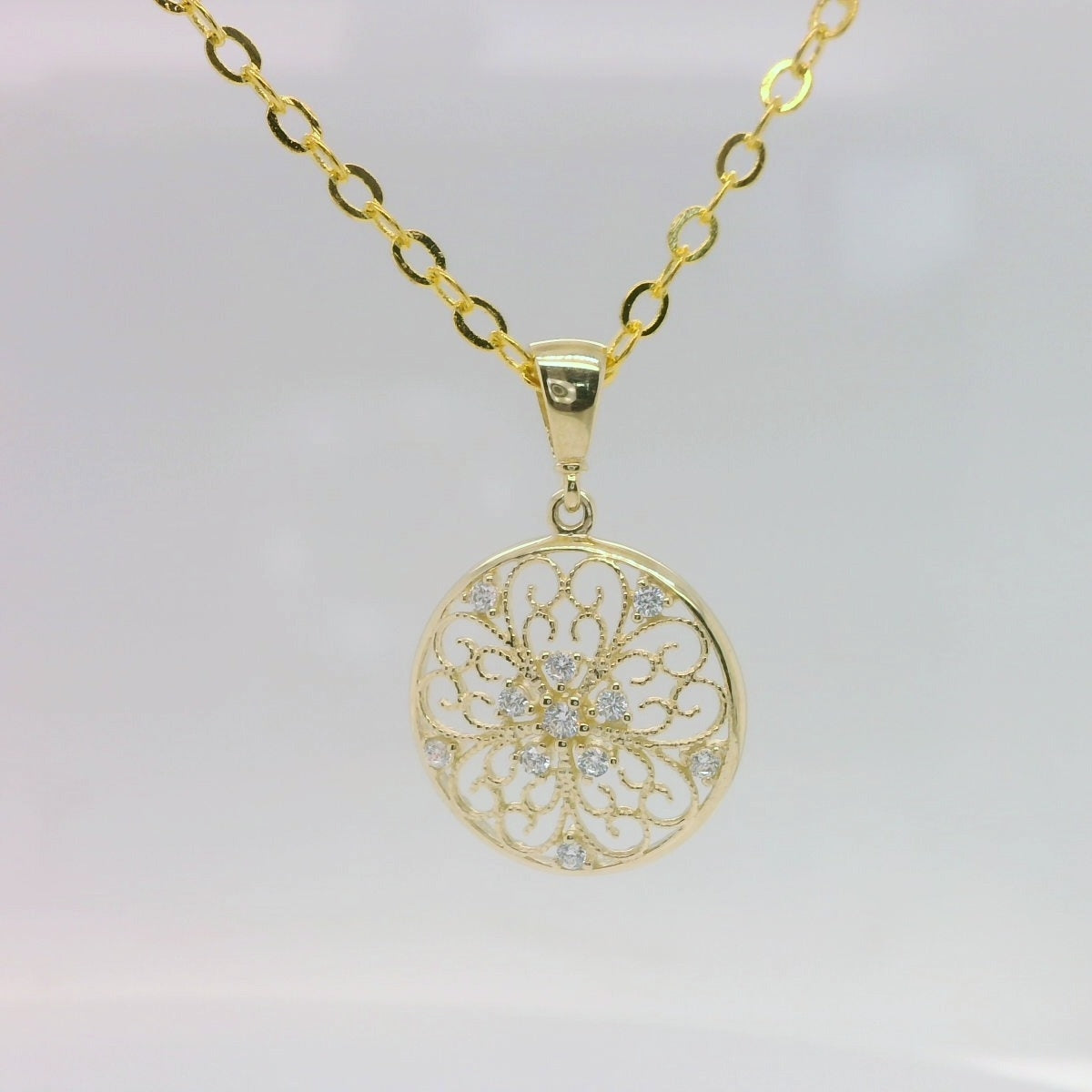 9ct Yellow Gold Filigree Circle Pendant with White Cubic Zirconia