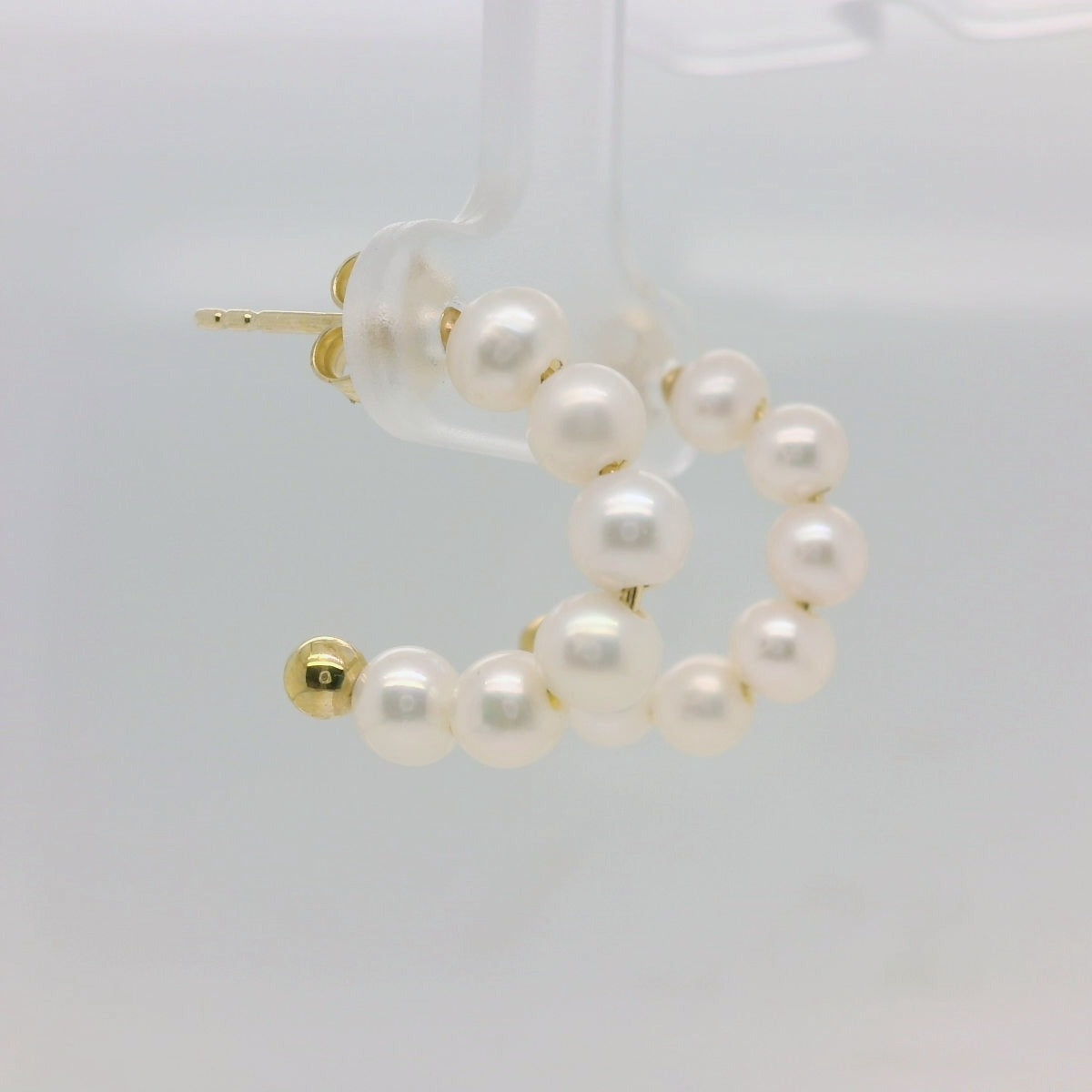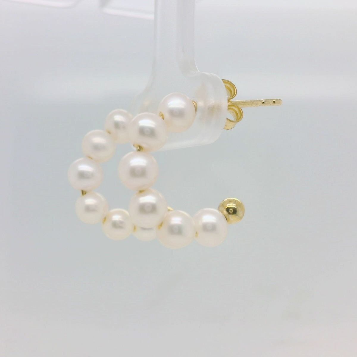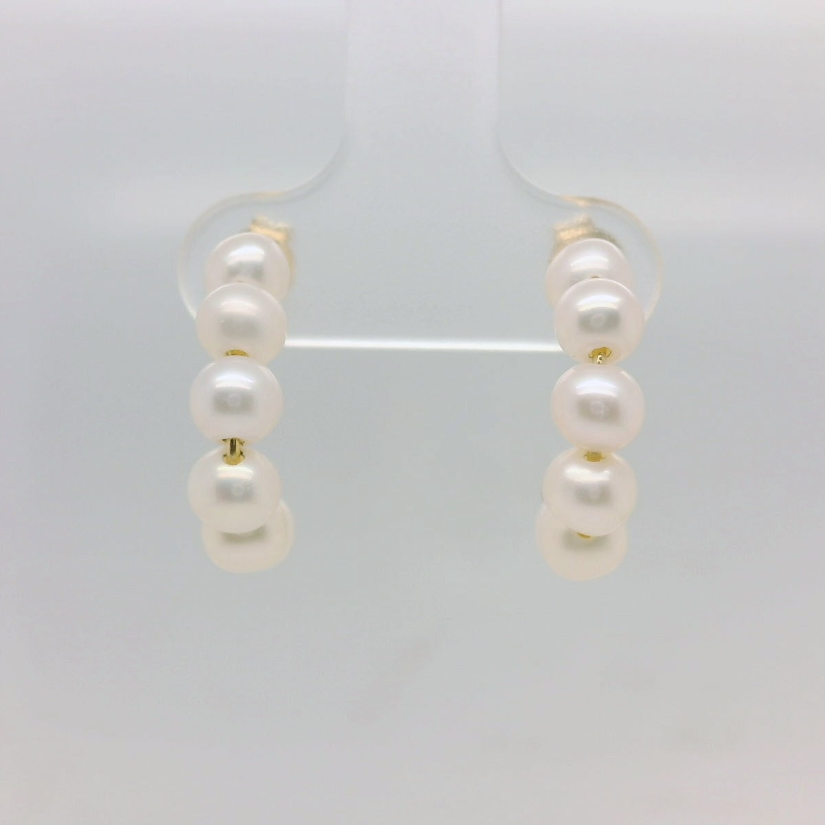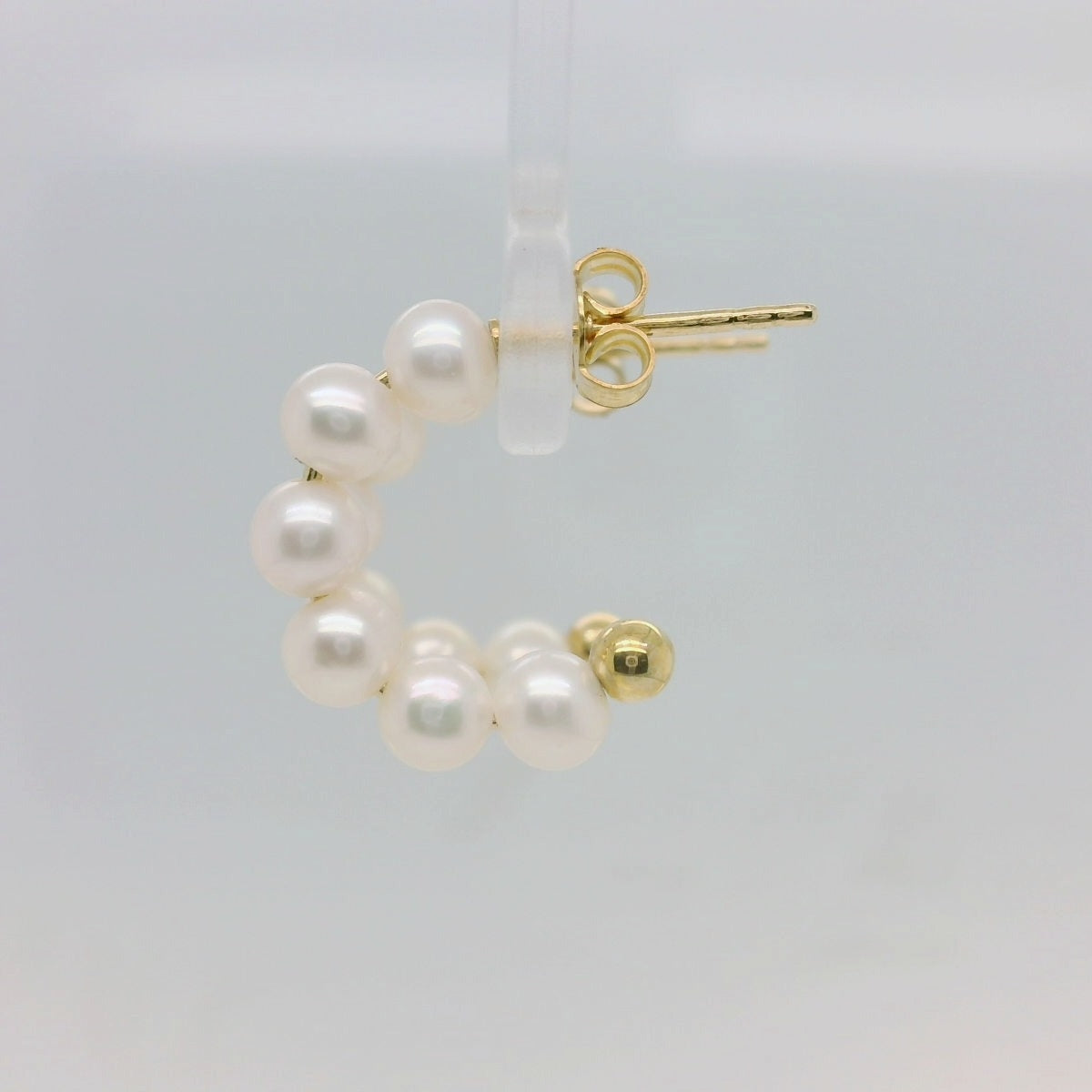 These graceful 9ct yellow gold stud hoop earrings are adorned with lustrous white freshwater pearls, delicately arranged to form the shape of each hoop. Combining classic elegance with a modern twist, the natural sheen of the pearls contrasts beautifully against the warm gold, creating a timeless accessory perfect for both everyday wear and special occasions.