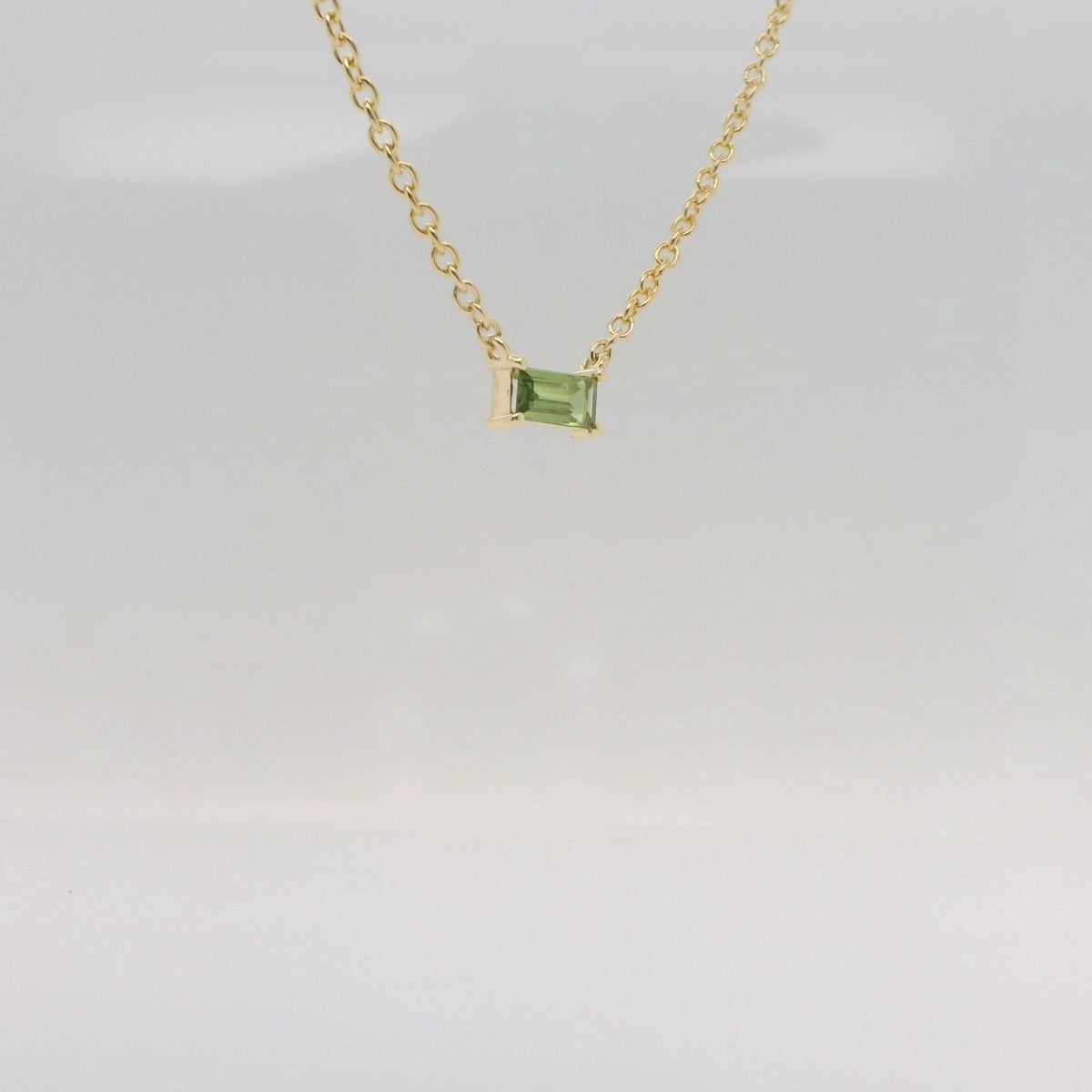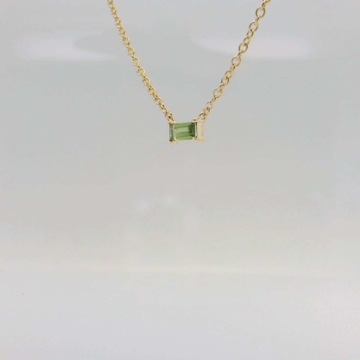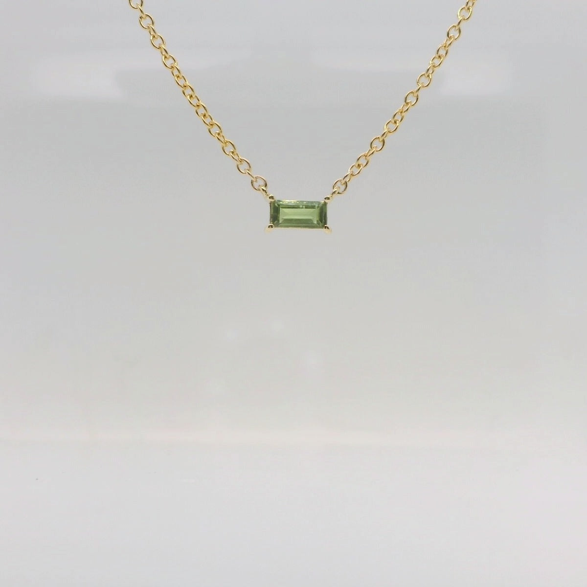 Sleek and sophisticated, this 9ct yellow gold pendant features a striking baguette-cut green sapphire, celebrated for its rich, earthy hue and modern elegance. The clean lines of the baguette cut perfectly complement the warm tones of the yellow gold, creating a minimalist yet luxurious look.