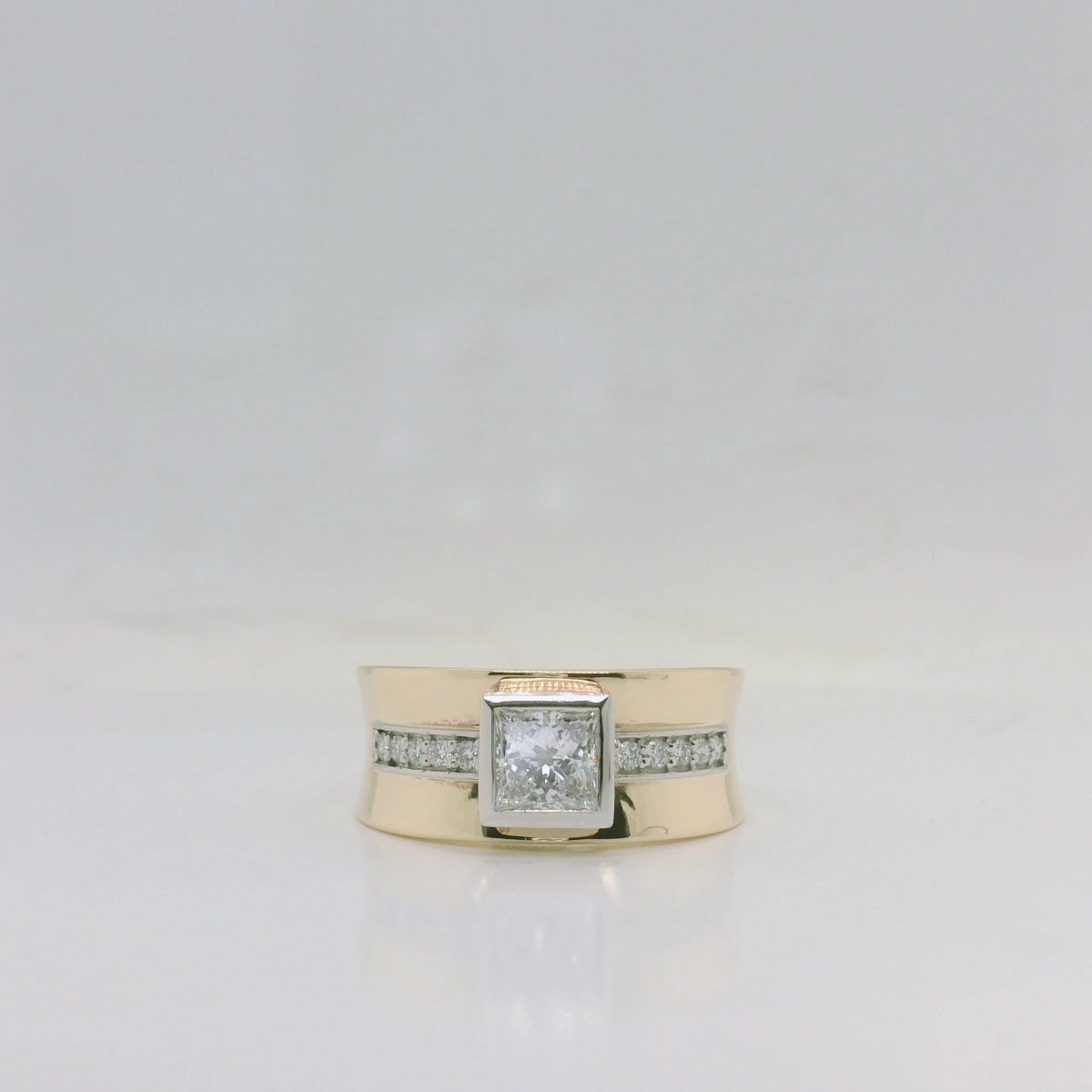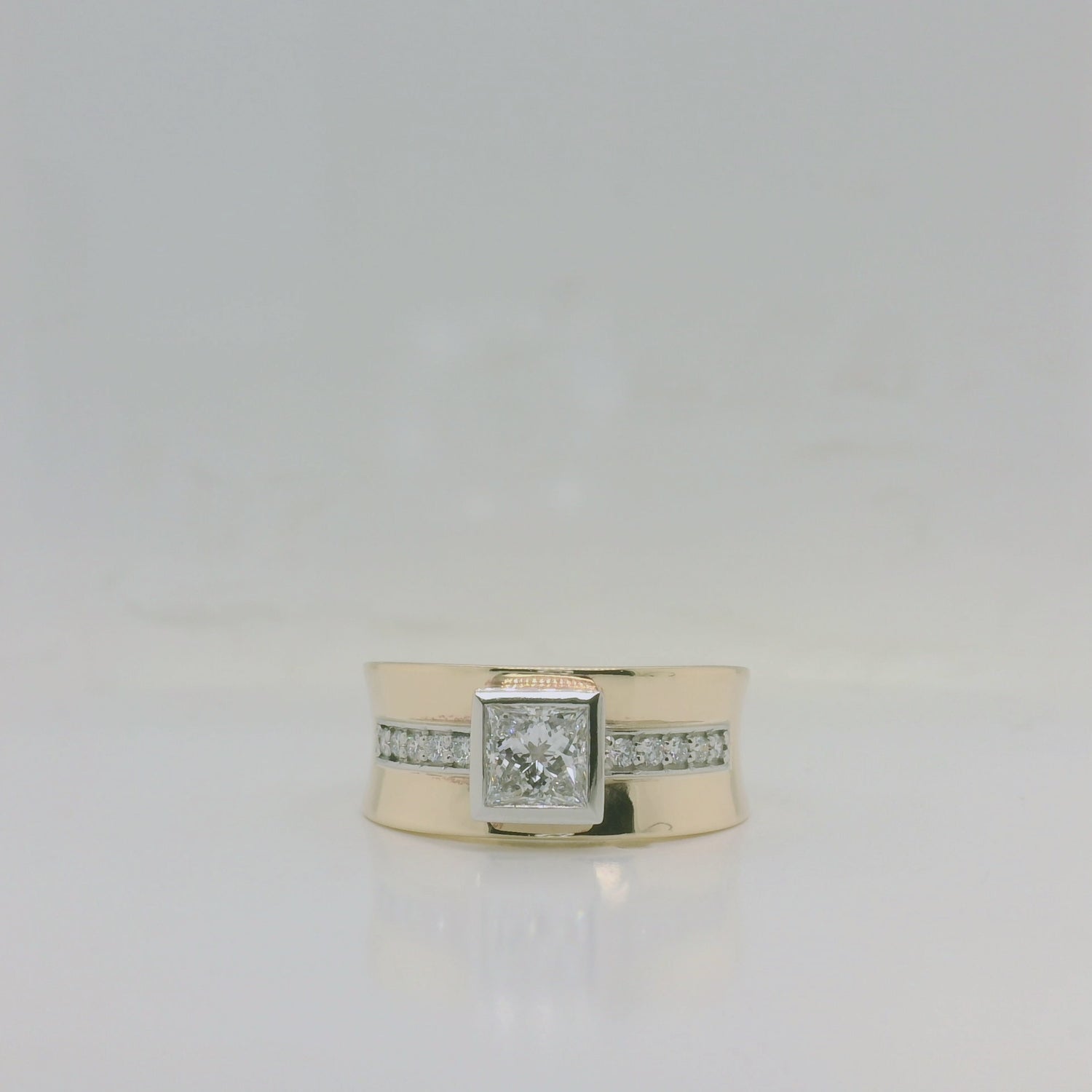 A contemporary yet timeless design, this ring is crafted in contrasting 9ct yellow gold and platinum with a sleek concave profile. At its centre sits a striking princess cut lab-grown diamond, bezel set for modern elegance, and enhanced by sparkling lab-grown diamond shoulder stones. With a total diamond weight of 0.94ct (E–F, VS2) and available in ring size Q (leading edge), this piece perfectly blends bold design with ethical luxury.