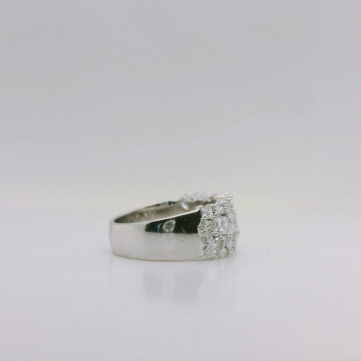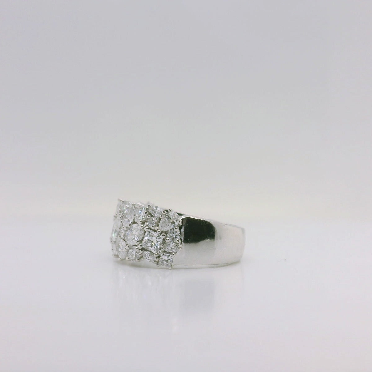 Crafted in luminous 9ct white gold, this wide, slightly domed ring is designed to make an unforgettable statement. A captivating cluster of lab-grown diamonds in a variety of shapes creates a sparkling mosaic across the top, giving the piece depth, brilliance and modern elegance. Bold yet refined, it’s the perfect ring for those who love eye-catching style with a luxurious twist. A true showstopper for any occasion.