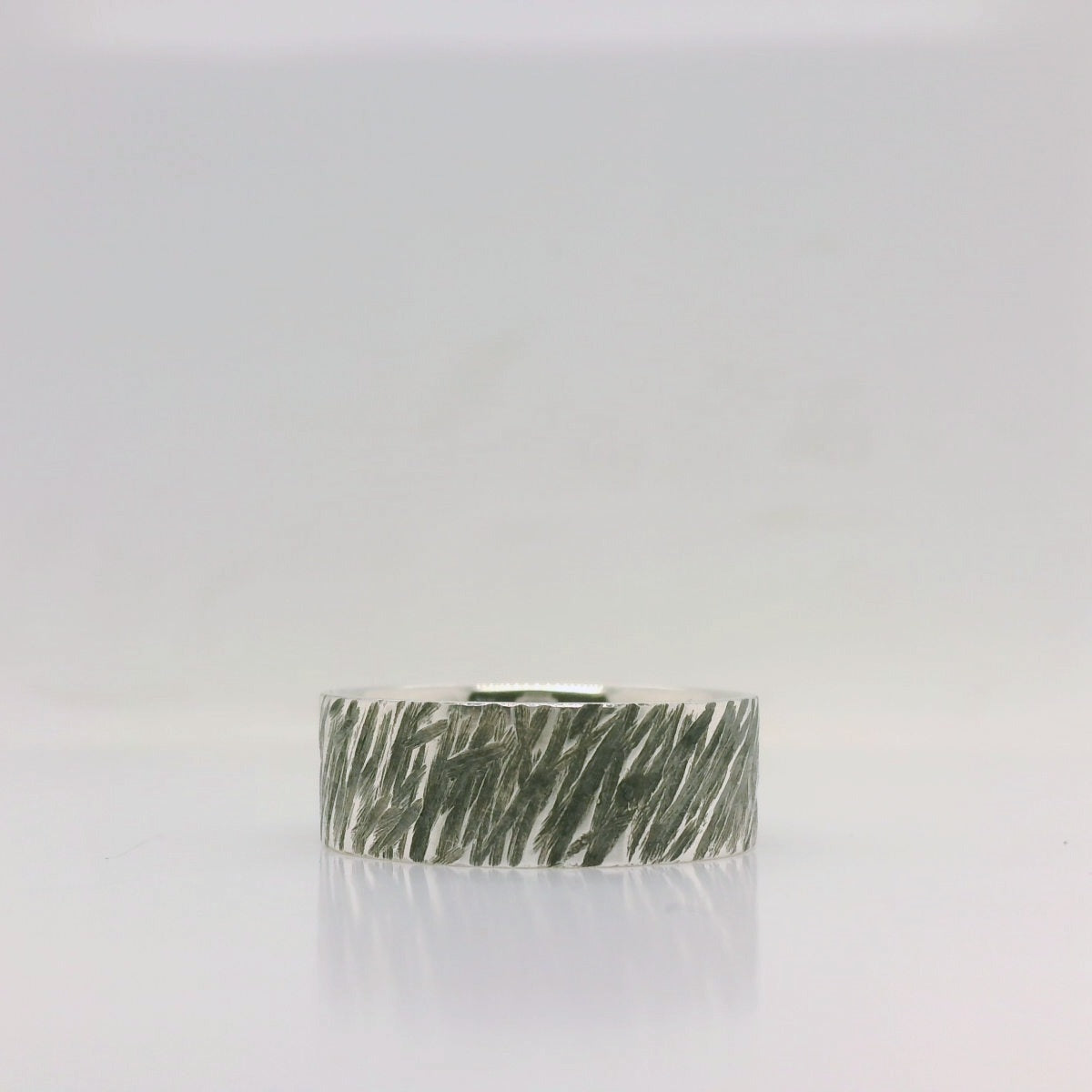 This unique handcrafted sterling silver ring features a rich oxidised finish that brings out the intricate textured surface, adding depth and character to the design. With a comfortable 7mm band width and a subtle 2mm height, this ring offers a bold yet understated statement piece. Sized Q, it’s perfect for those who appreciate artisan craftsmanship and distinctive style.