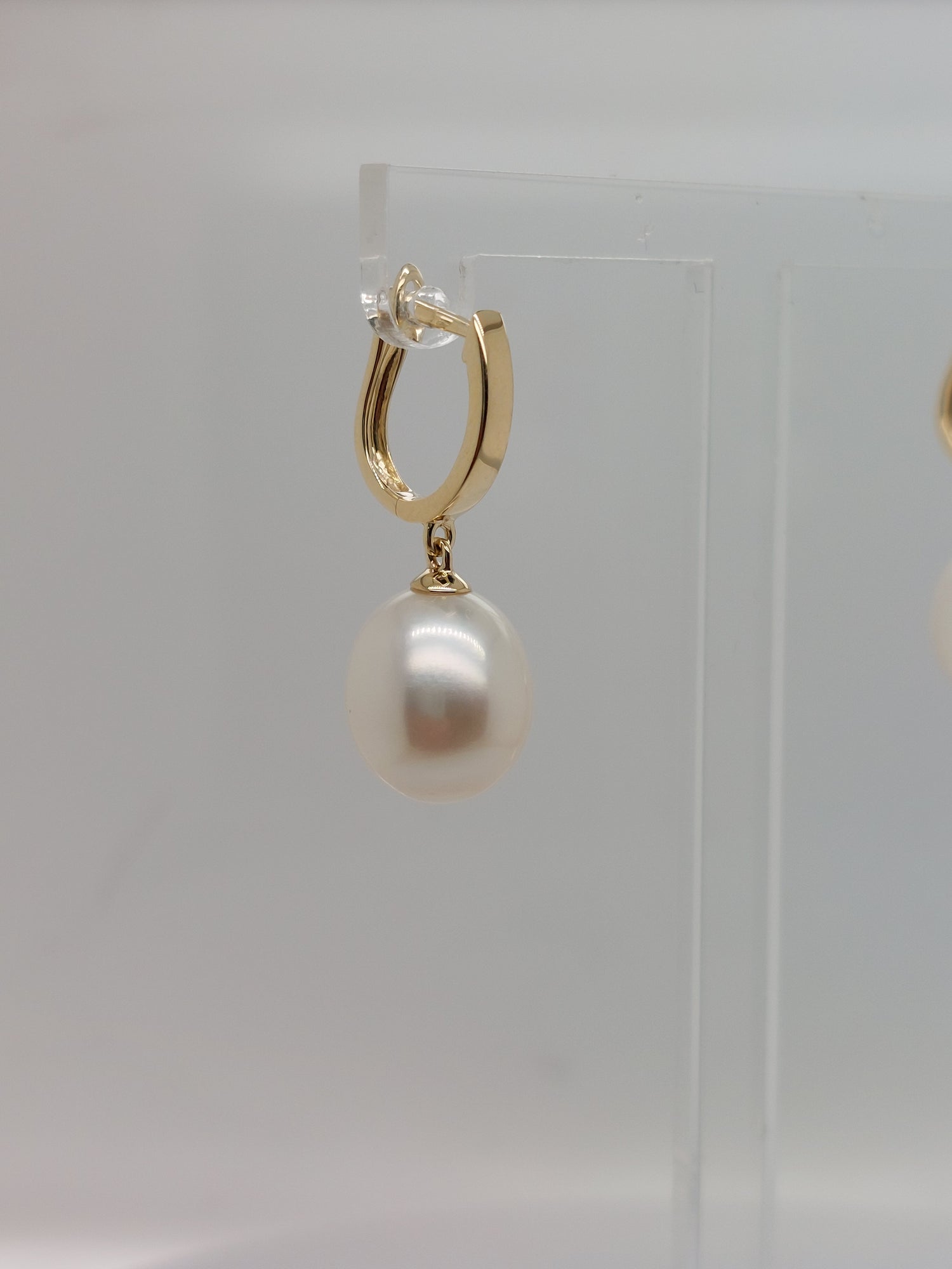Elegant and timeless, these 9ct yellow gold huggie earrings feature a luminous 9–9.5mm white freshwater pearl suspended delicately below. Measuring 23mm x 9mm, the refined design combines classic sophistication with everyday wearability, making them perfect for both casual and special occasions.