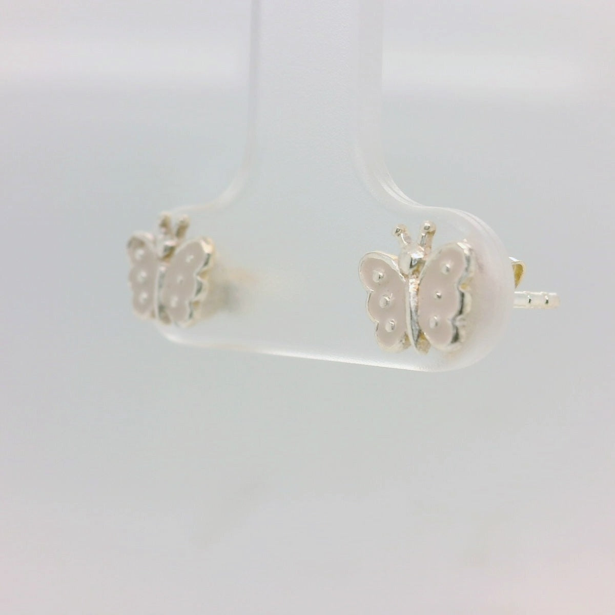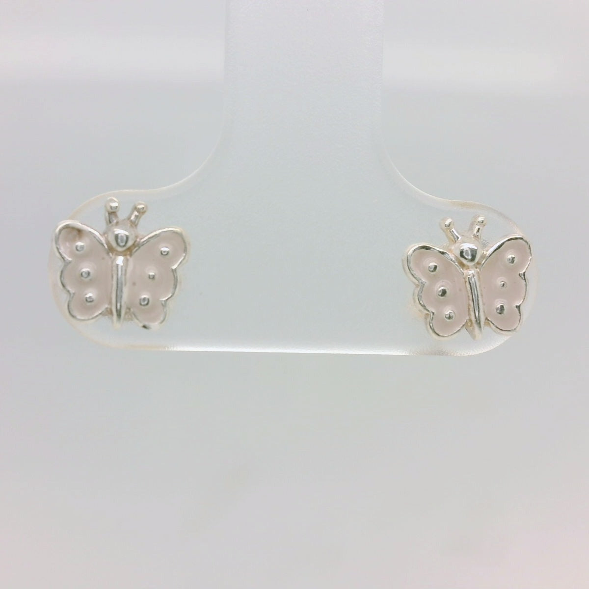 These sterling silver butterfly stud earrings feature soft pink enamel detailing, creating a charming and feminine accessory. Perfectly sized for everyday wear, they add a graceful, colorful touch to any look.