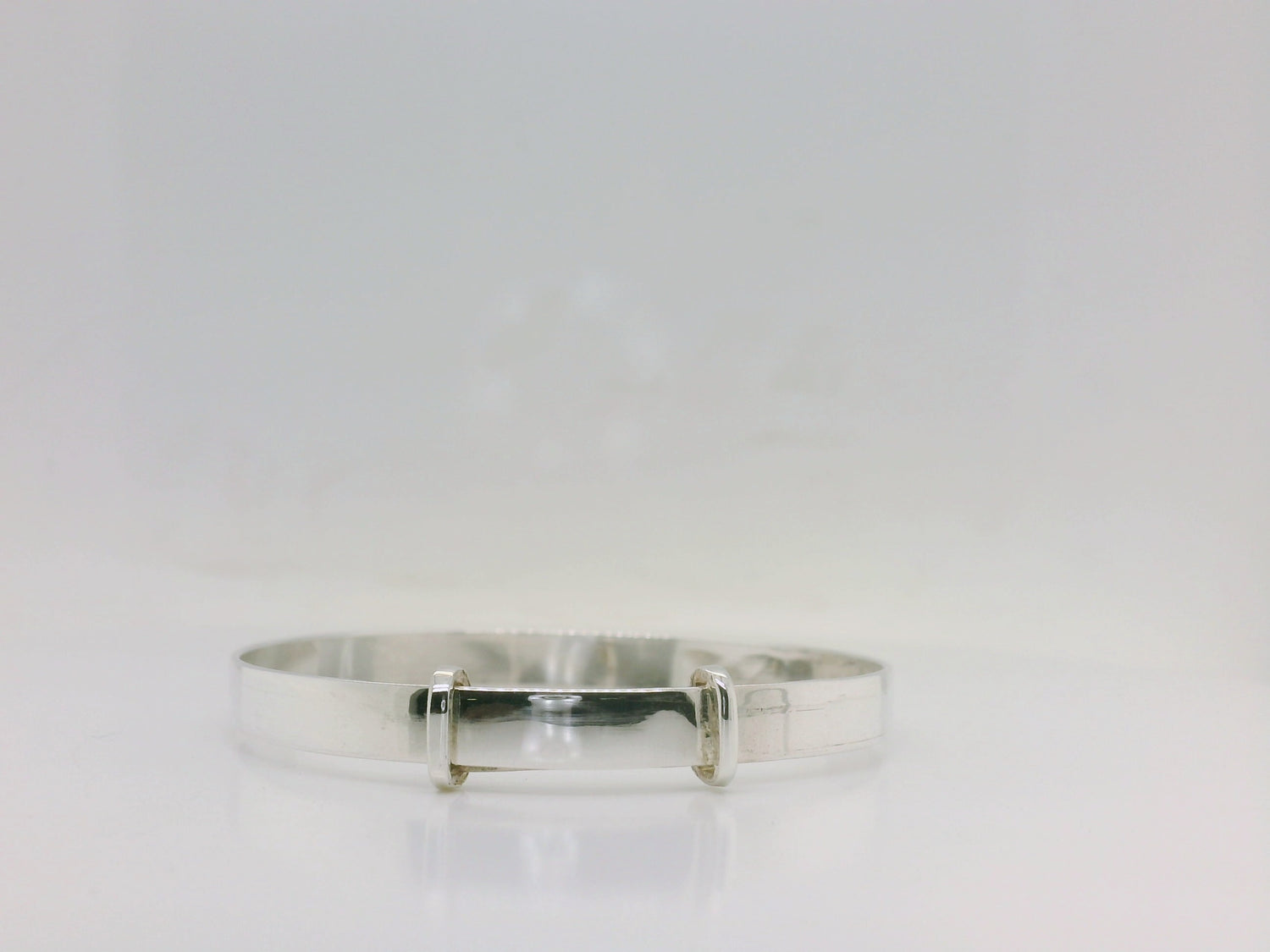 This sterling silver baby’s bangle features a sleek 5mm width and an expandable design, adjusting from 40mm to 51mm inside diameter for a perfect, comfortable fit as your little one grows. A timeless keepsake made for everyday wear and cherished memories.