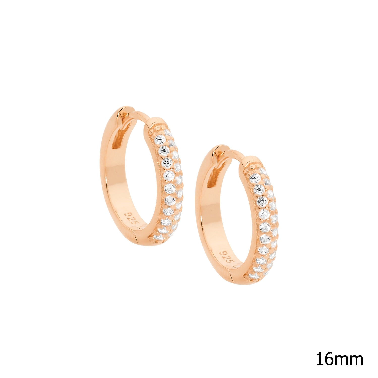 Ellani Collections - Sterling Silver Rose Gold plated huggie earrings pave set with white cubic zirconias