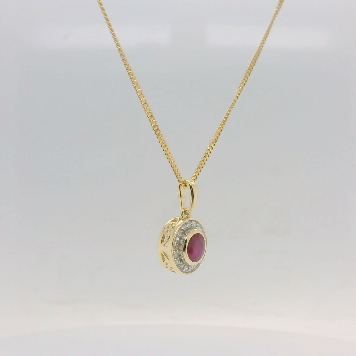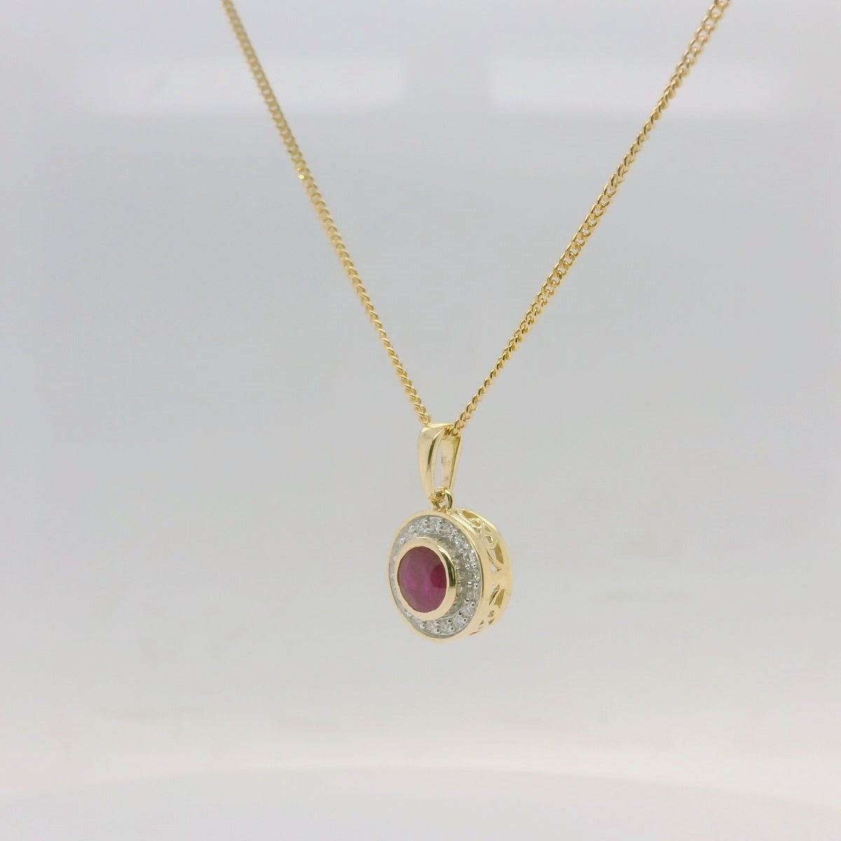 Elegant and timeless, this 9ct Yellow Gold Cluster Pendant features a rich ruby at the centre, surrounded by a halo of sparkling diamonds (TDW 0.20ct) that enhance its vibrant beauty. A classic design that radiates sophistication and charm.