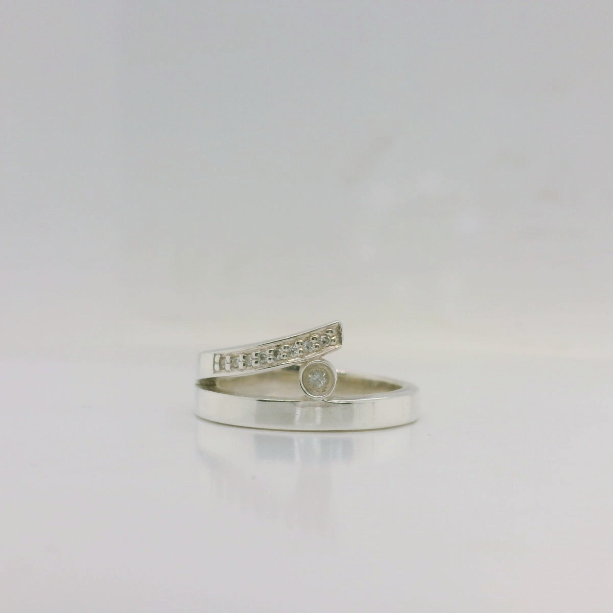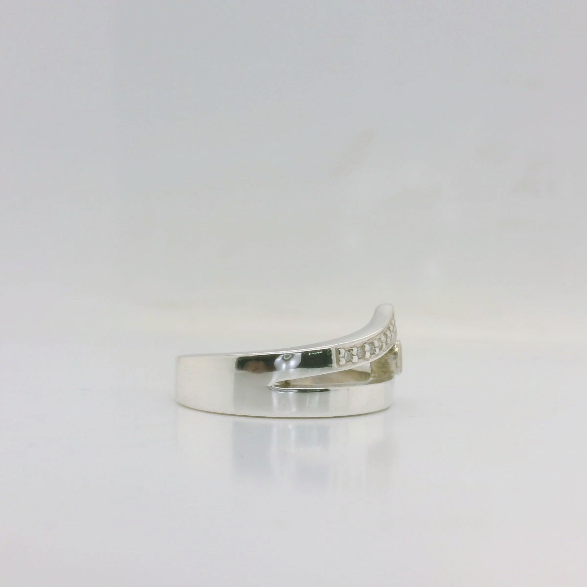 This stunning sterling silver ring features a flowing crossover design, beautifully accented with sparkling diamonds for added brilliance. With a graceful silhouette that tapers from 3mm to 9mm in band width and a sleek 3mm ring height, it blends contemporary style with timeless elegance. Sized O, it's the perfect piece to elevate any jewellery collection.