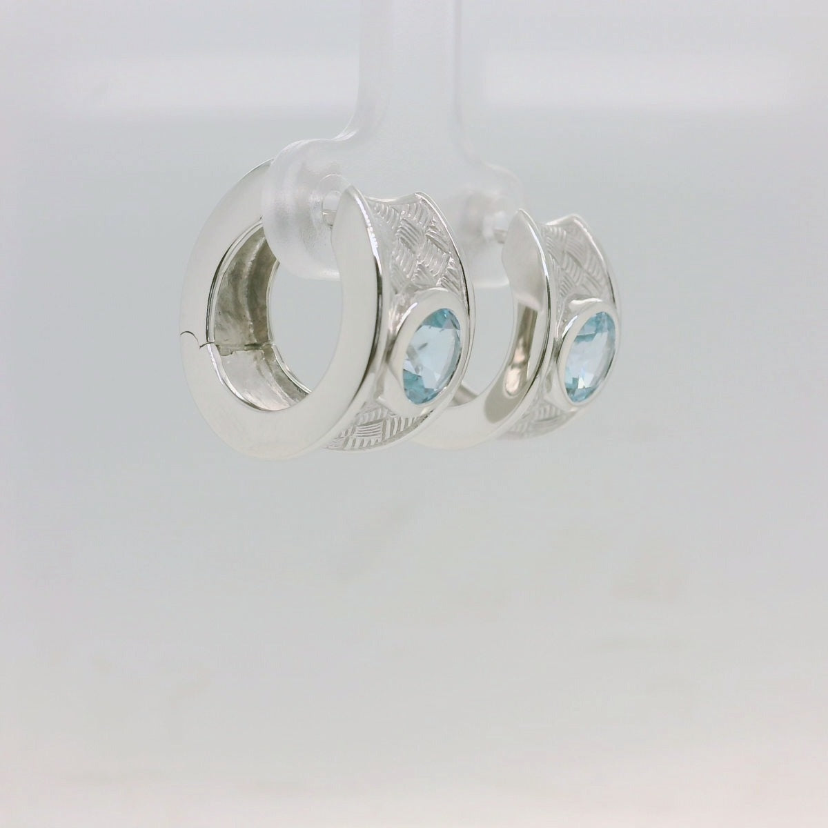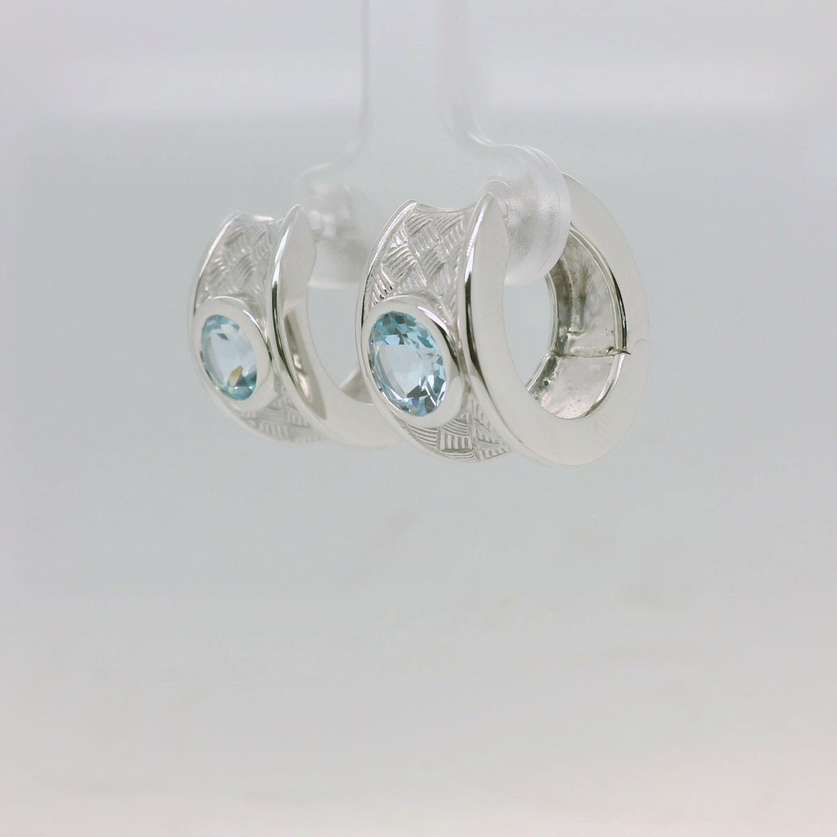 Elevate your everyday style with these elegant Sterling Silver Tapered Huggie Earrings, featuring a beautifully detailed woven texture and a shimmering blue topaz accent. Crafted in polished sterling silver, the tapered silhouette hugs the earlobe for a secure and comfortable fit, while the intricate woven design adds depth and character.