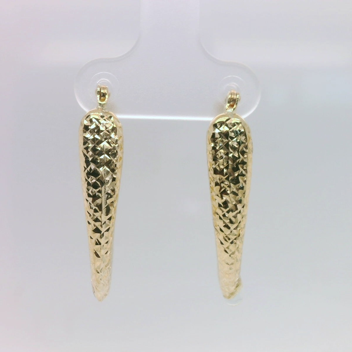 These striking 9ct yellow gold earrings feature an elongated V-shape design with a beautifully textured finish that catches the light from every angle. Measuring 27mm in length and 13mm in width, they offer a bold yet elegant statement perfect for dressing up any outfit. Lightweight and contemporary, these earrings bring a touch of modern sophistication to your jewellery collection.