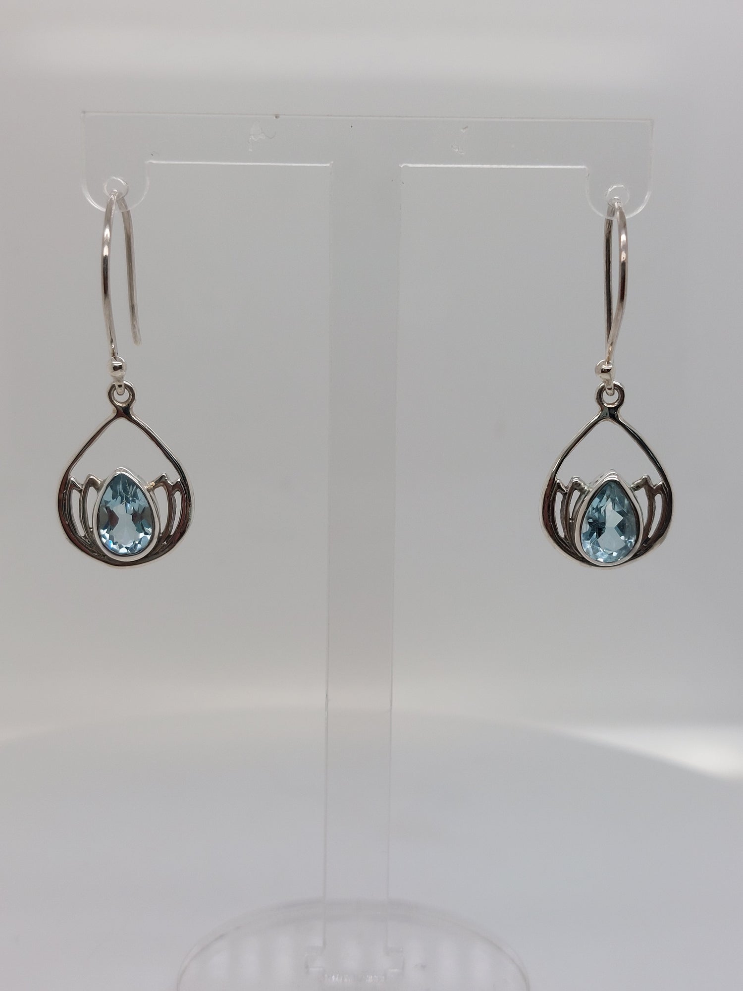Delicate and enchanting, these Sterling Silver Blue Topaz Lotus Drop Earrings capture the serene beauty of the lotus flower, accented with shimmering blue topaz stones. Measuring 31mm by 12mm, their graceful drop design adds elegance and a splash of calming colour to any look.