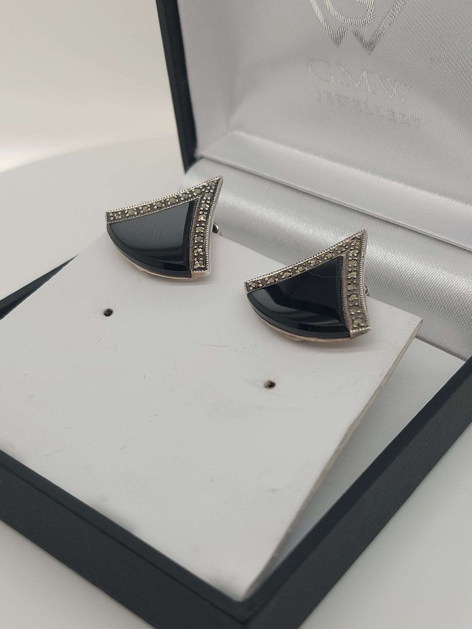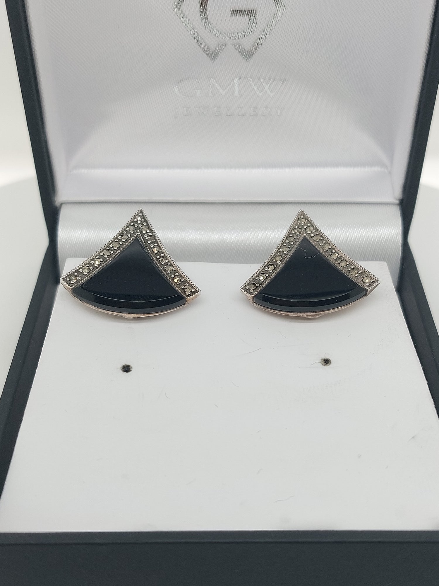 Sterling Silver Triangle Clip-On Earrings with Black Onyx & Marcasite