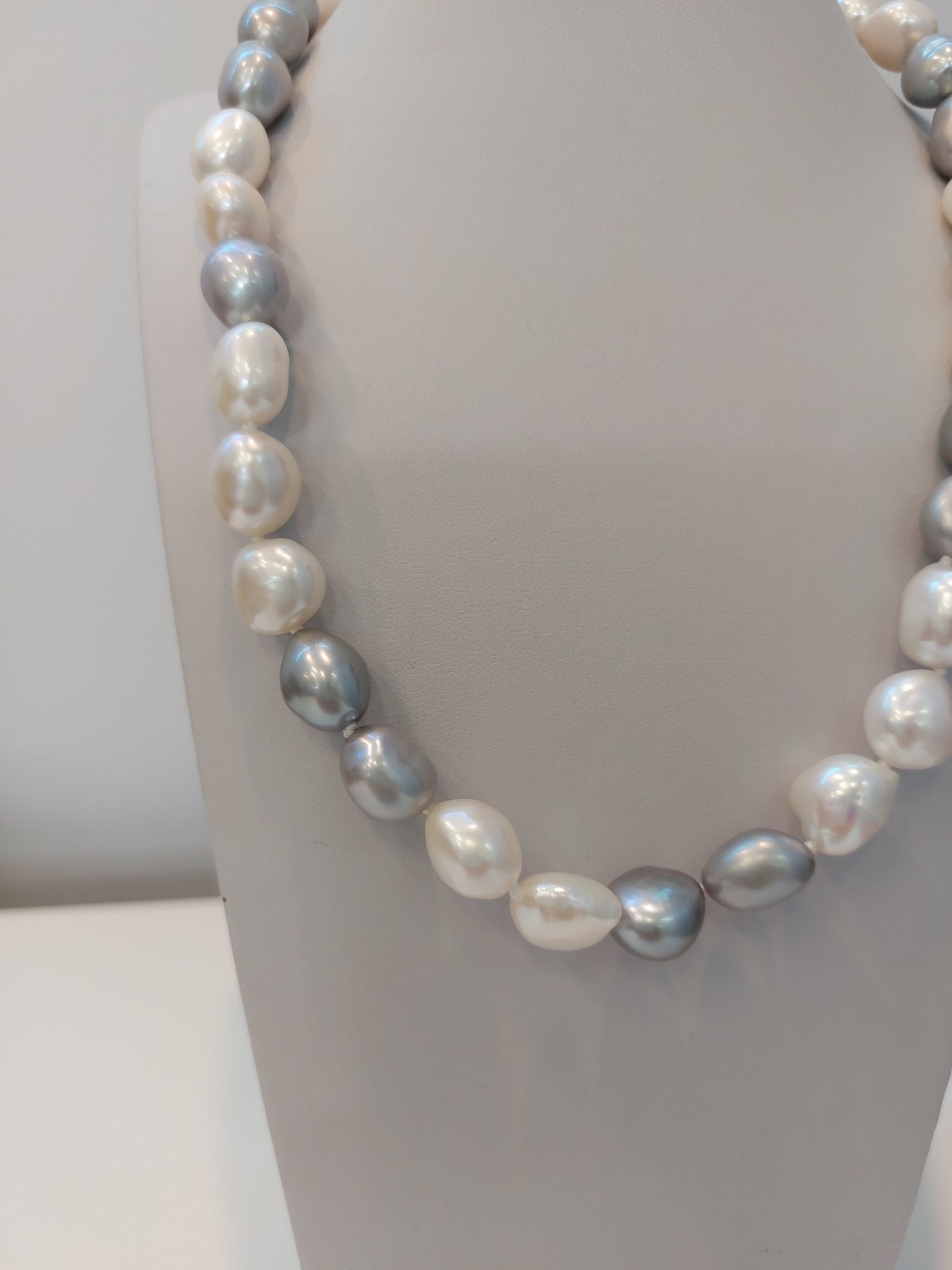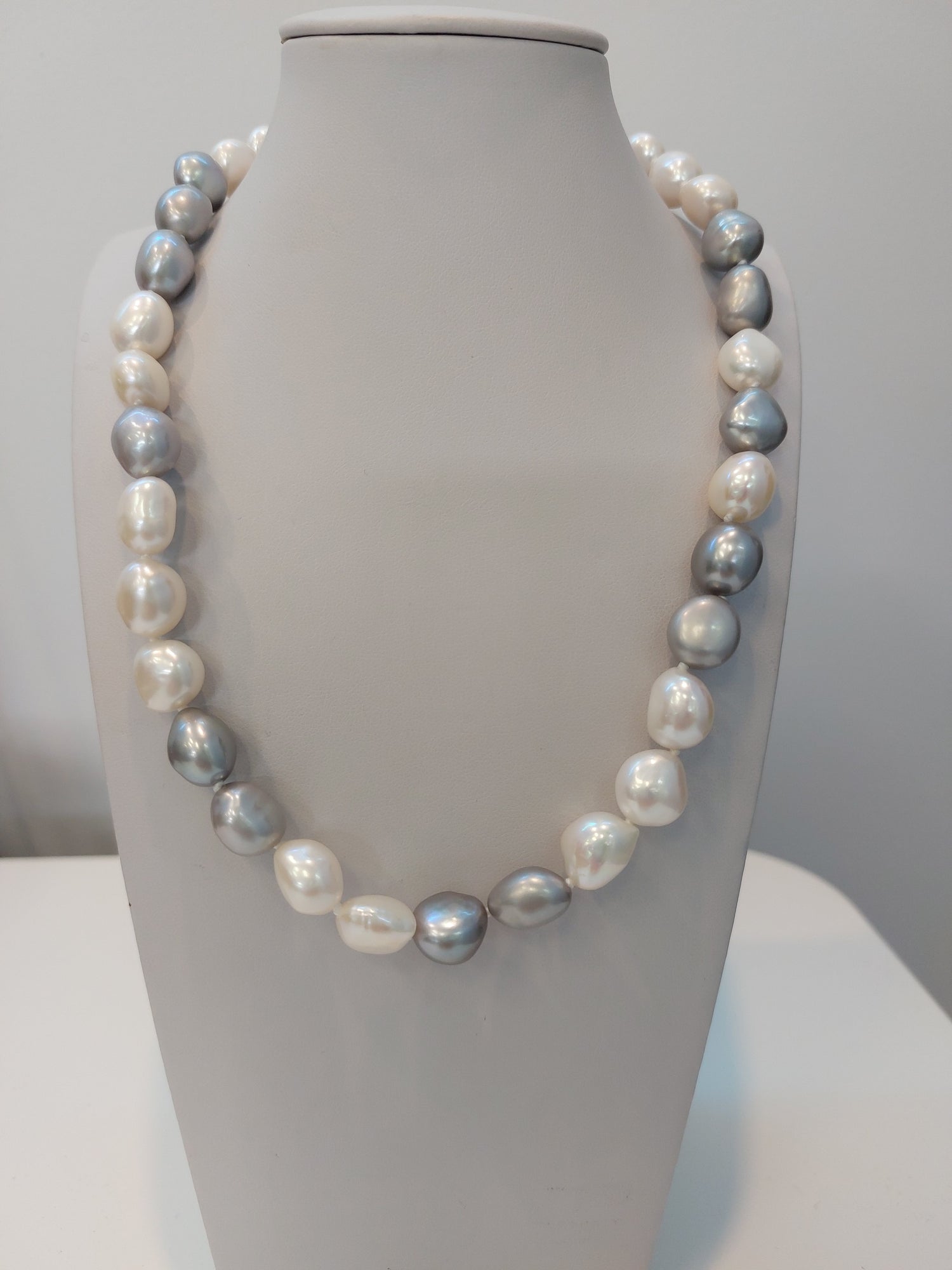 Freshwater pearl, grey and white mixed strand with a Sterling Silver chunky parrot clasp